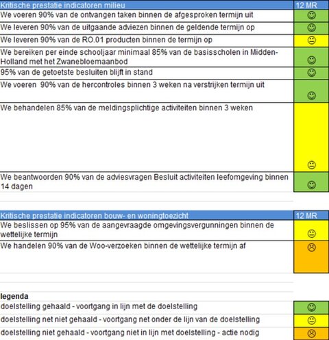 In de eerste vijf maanden van 2025 behaalden we drie van onze doelstellingen niet (oranje) en vijf net niet (geel). We hebben er hard aan gewerkt en het resultaat mag er zijn. We hebben bijna alle KPI’s gehaald. De KPI ‘We handelen 90% van de Woo-verzoeken binnen de wettelijke termijn af’ is niet gehaald vanwege de omvang van een aantal verzoeken. Ook het gezamenlijk optrekken van verschillende overheden bij de afhandeling zorgt hier soms voor vertraging.