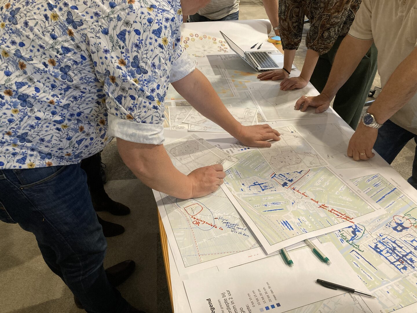 De ODMH begeleidde de regionale stresstest. We organiseerden een gezamenlijke ontmoeting met de vijf regiogemeenten. Onze ketenpartners - veiligheidsregio, waterschappen, GGD en GHOR - sloten ook aan. Daar bespraken we vier klimaatthema’s: wateroverlast, hitte, droogte en overstroming. Na een plenair deel gingen de deelnemers in kleine groepen uiteen, waar zij zich letterlijk bogen over de kaarten. De lokale kennis vanuit de gemeenten was van grote waarde. Tegelijk leverde het de gemeenten zelf ook iets op: door de gezamenlijke werkwijze deden zij tools en handvatten op om zo’n kaart zelf te gaan ontwikkelen. De opbrengst van de uitwisseling in de sessies verwerkte de ODMH in GIS kaarten. Daarop zijn kansen en knelpunten per thema samengevat. Die zijn te raadplegen met een KaartViewer.