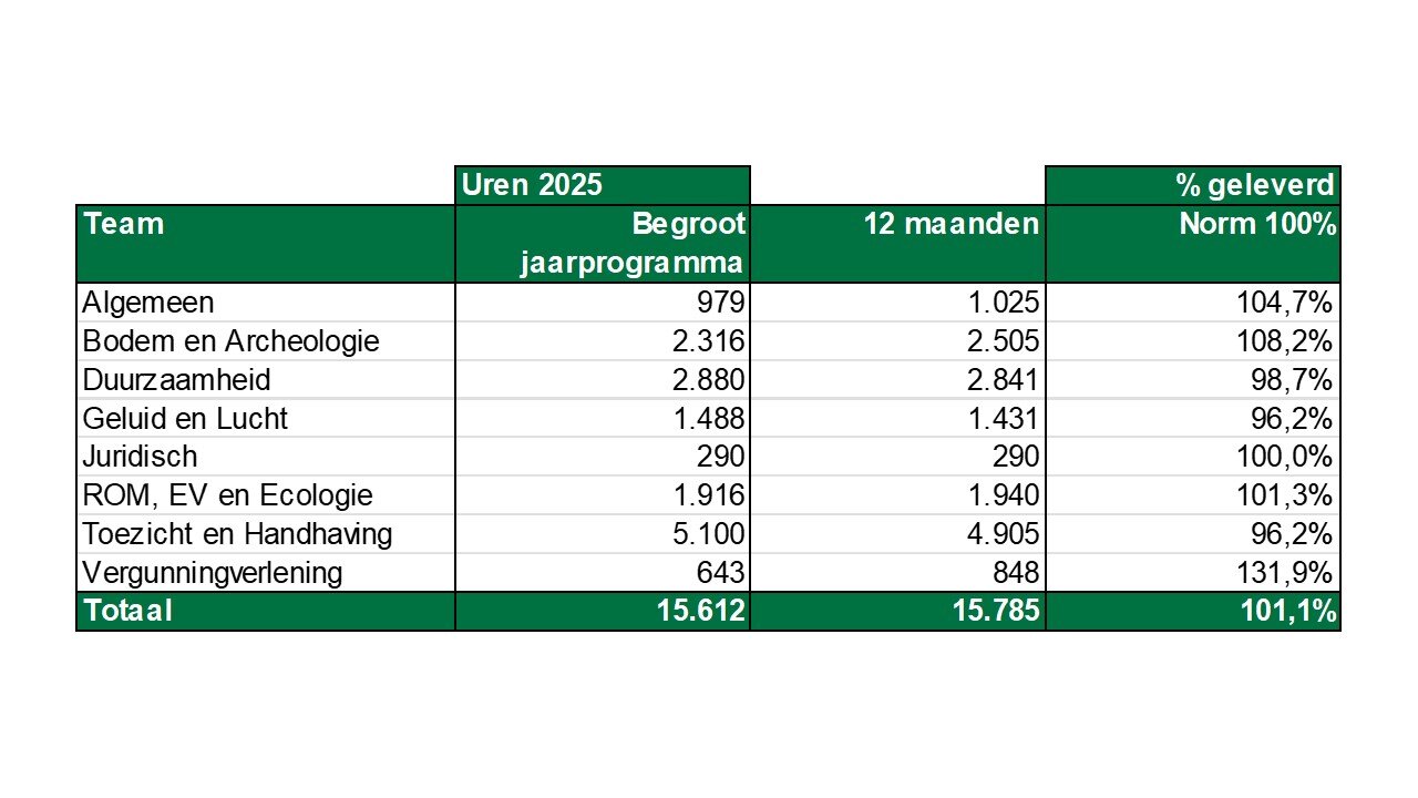 De grootste uitschieters bij milieu zijn Bodem en Archeologie en Vergunningverlening. Bij deze teams gaat het vooral om vraag gestuurde producten en worden gecompenseerd door de realisatie bij de teams Duurzaamheid, Geluid en Lucht en Toezicht en Handhaving. De realisatie van deze teams liggen onder de uren die in het jaarprogramma zijn afgesproken.