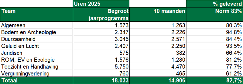 De grootste uitschieters bij milieu zijn bodem en geluid en lucht. Bij deze vakgroepen gaat het vooral om vraag gestuurde producten. Vakgroep Toezicht en Handhaving zit ruim onder de norm van 83% maar wordt hier extra mankracht op ingezet om aan het eind van 2025 op 100% uit te komen. Op dit moment lijkt de realisatie aan het eind van het jaar op ongeveer 101% uit te komen.