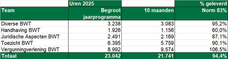 Voor het thema Handhaving BWT is de realisatie met 60% lager dan het gemiddeld aantal uren dat begroot is. De verwachting is dat de realisatie iets zal achterblijven tegenover de begrote aantal uren.
