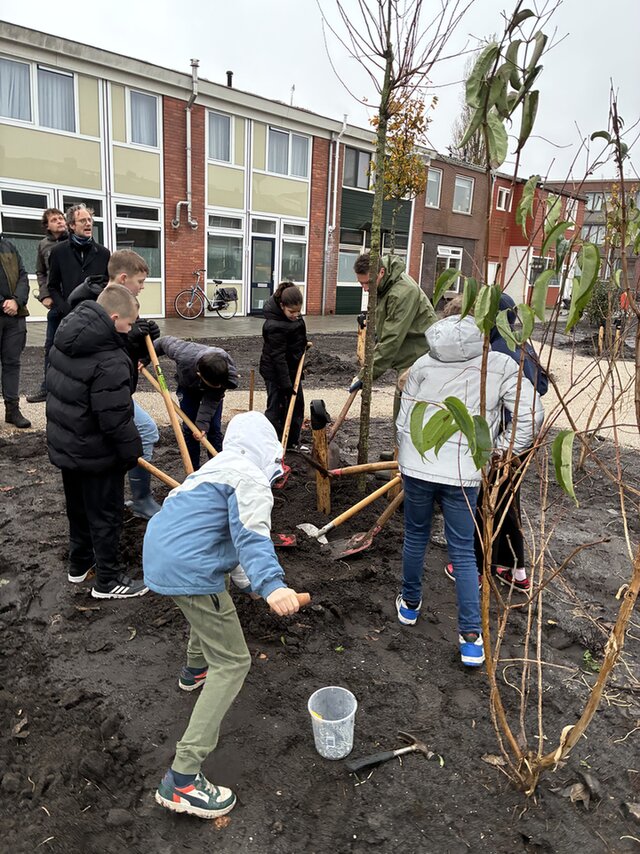 Nieuwe bomen in Gouda met blije kinderen en heel veel modder!