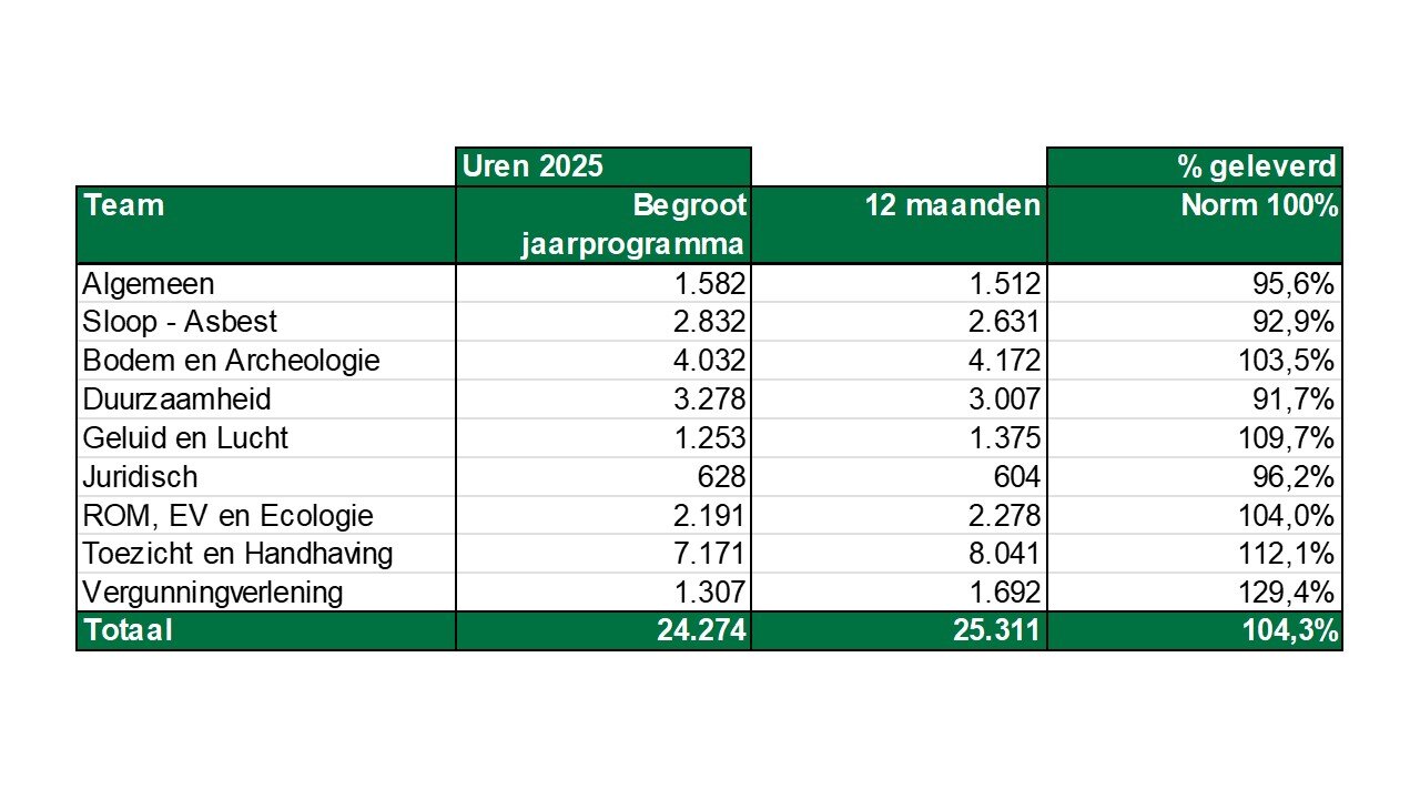 De gerapporteerde realisatiecijfers geven inzicht in de begrote en gerealiseerde uren over het jaar 2025. Naast de uren in absolute aantallen, treft u ook de verhouding tussen beide aan in procenten. Voor het gehele jaar 2025 is een realisatie van 100% gewenst.