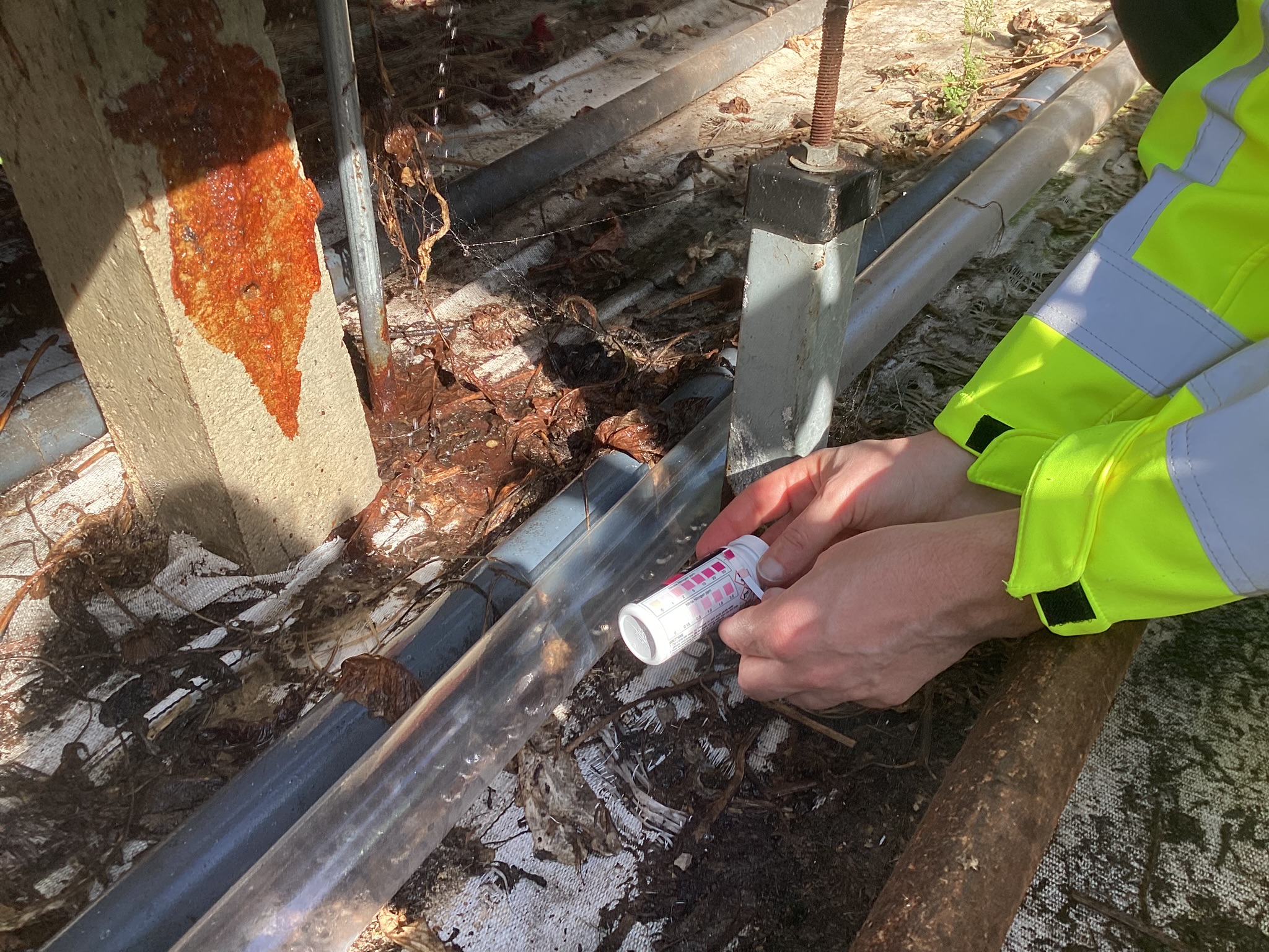 Na een melding van het waterschap HHSK over hoge nitraatwaarden controleerden wij een gerbera-kas. We troffen natte plekken, plassen en lekkende systemen aan. Voedingswater en gewasbeschermingsmiddelen sijpelden weg naar de bodem – een bodemlozing. Dit bedrijf kreeg in 2023 adviezen na een waterscan. In 2024 volgde een waarschuwing.
