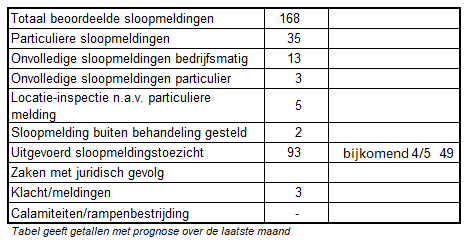 De in de tabel aangeven 4/5 zaken sloopmeldingstoezicht, betreffen zaken waarbij wij op basis van de werkafspraken geen controle uitvoeren. Deze zaken worden beoordeeld op volledigheid en gesloten zonder afrekening.